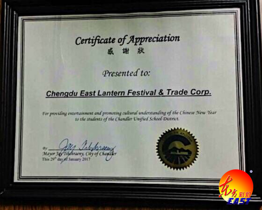 自貢燈貿集團股份有限公司、四川藝思特彩燈文化傳播有限公司主辦的“2016世界之光——彩燈嘉年華”跨年燈展,于當地時間2017年1月29日在美國亞利桑那州首府菲尼克斯(鳳凰城)順利落下帷幕。成都市委副秘書長、印第安納州州長 Burns Mike及當地政府要員出席閉幕式并代表州政府對本次燈展頒發(fā)特令嘉獎。