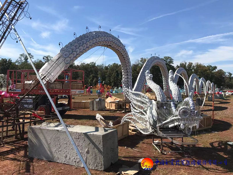 美的創(chuàng)造離不開現(xiàn)代科技手段,“2018年華盛頓環(huán)球燈會(huì)”運(yùn)用有:LED幻彩變光技術(shù),使燈組物理空間上的呈現(xiàn)更加動(dòng)感迷人;光束燈技術(shù),美輪美奐的五彩射光,伴隨著音樂的變化此起彼伏,現(xiàn)場觀看最能切身體會(huì)魅力四射的藝術(shù)效果;吹塑紙技術(shù)的創(chuàng)新,營造出光鮮亮麗、惟妙惟肖的事物造型,讓人嘆為觀止;特殊材質(zhì)飲料瓶這一精湛工藝,在環(huán)保的同時(shí)又呼吁人們愛護(hù)自熱環(huán)境;仿真技術(shù)的成熟應(yīng)用,又還原了遠(yuǎn)古時(shí)代的恐龍世界。