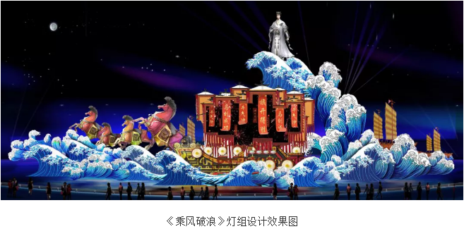 西區(qū)湖面上,長(zhǎng)65米,高22米的主題燈組“乘風(fēng)破浪”是本屆廟會(huì)中的“巨無(wú)霸”,利用現(xiàn)代燈光技術(shù)以獨(dú)特的藝術(shù)手法展現(xiàn)了三國(guó)時(shí)期的著名戰(zhàn)役——赤壁之戰(zhàn)。一幕精彩的三國(guó)故事圖卷將在波光粼粼的湖面上徐徐鋪展。