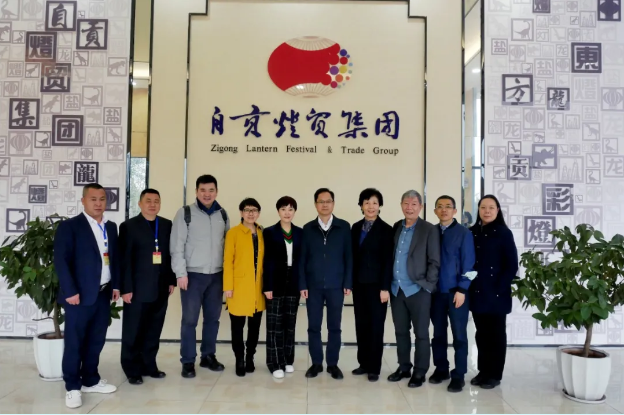 (考察團一行在公司創(chuàng)意、設計、制作的《巴蜀一家親》、《自貢記憶》燈組合影)