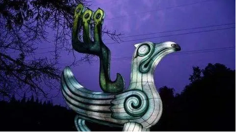 入口兩側(橋外側)處,設置了兩只相似但不相同的鳳鳥燈組立于入口兩側通道處,高2.8米。以青銅鳳鳥為設計原型,鳥與蜀族之關系極為密切,三星堆館藏文物中有眾多的鳳鳥形器物及紋飾圖案。